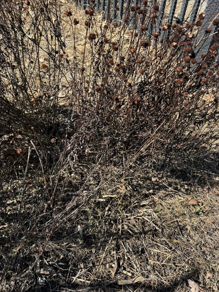 Sometimes the perennial flower beds get cleaned up on a sunny day in January but that didn’t happen this year. Clean up just means chop and drop, letting the dried stalks and such form a mulch. There’s good reason not to do more clean up than that. See below on the dried brown-eyed susan coneflower: likely a praying mantis case. I found three of them in a small patch of garden.