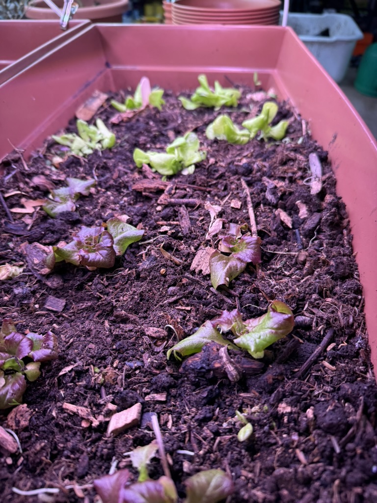 Seedlings that will go out in a few days (lettuce) and a couple of weeks (onions)